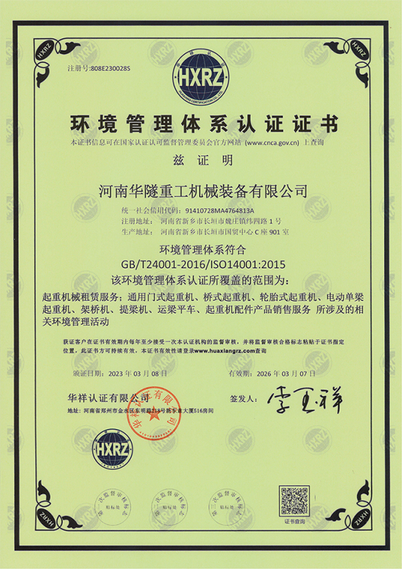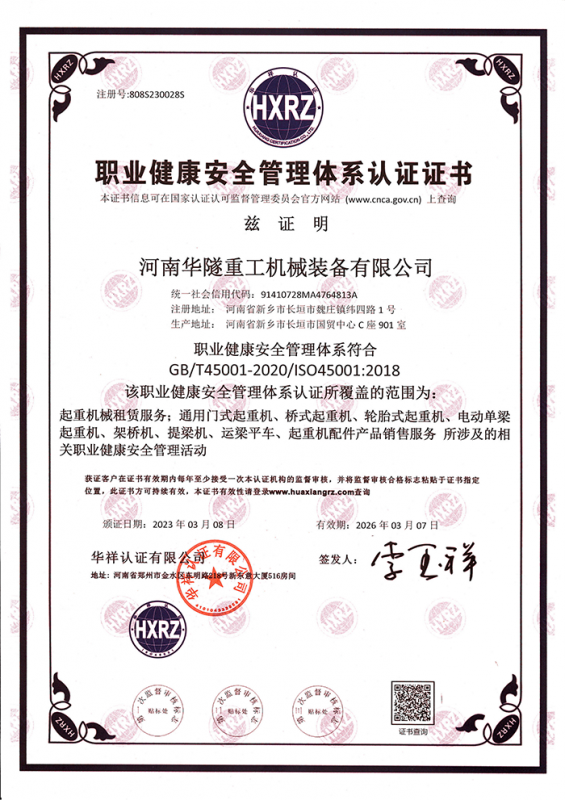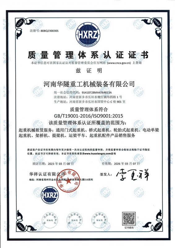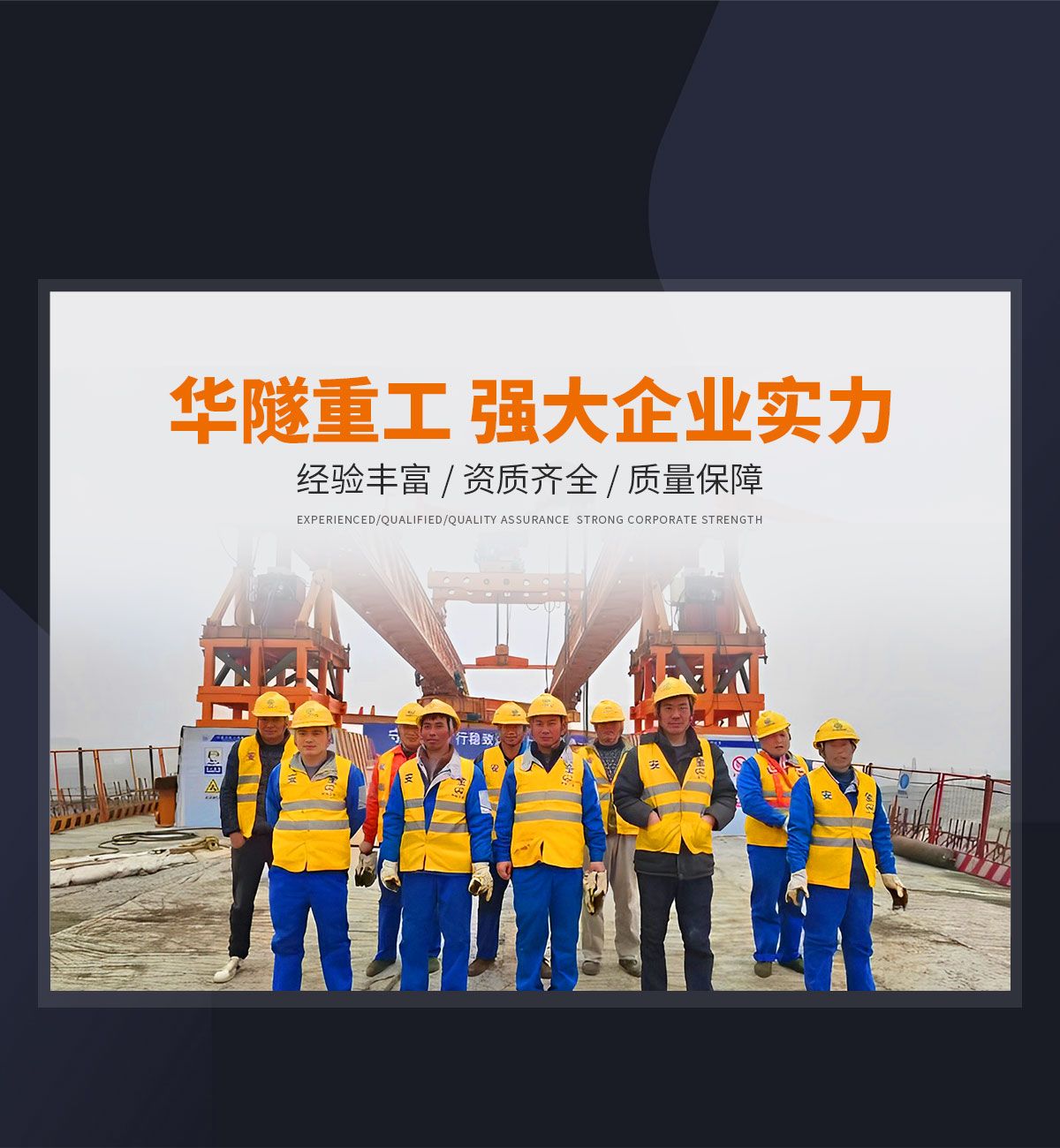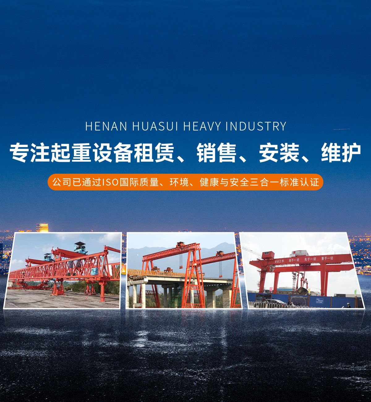 河南華隧重工機械裝備有限公司主要從事通用門式起重機、橋式起重機、電動單梁起重機,輪胎式起重機、架橋機、提梁機、遠梁平車、鋼絲繩電動萌蘆、卷揚機、起重配件制造、銷售:起重機械租賃、安裝和維修,起重設備園收,機械設備維修,鋼結構工程承包,橋梁工程及技術咨淘服務,銷售五金制品、機電設備:建設工程監(jiān)理,建設工程設計,各類工程建設活動,建筑勞務分包,建筑物折除作業(yè),施工作業(yè),工程管理服務,土石方工程施工,裝如發(fā)運。  公司已通過IS0國際質量、環(huán)境、健康與安全三合一標準認證,特種設備制造許可證和特種設備安裝改造維修許可證。擁有完熟的質量管理體系。嚴格的管理制度,強大的生產(chǎn)能力和先進的檢測手段,在保證產(chǎn)品質量的同時,也具備了極強的市場競爭力。  公司堅持科技創(chuàng)新為理念,產(chǎn)品質量為核心,注重信譽,建立了減信可靠、快捷、思速。便利周到的售后服務網(wǎng)絡。  我們擁有的技術專家和技術服務隊伍為客戶提供充善的售前技術支持和全天候的售后服務體系,讓您無后顧之憂,享受一站式的超值服務。  “華隧重工,伴您成功“是華隧重工永遠的宗指,真被的希望與各界朋友攜手并進。共創(chuàng)輝準!